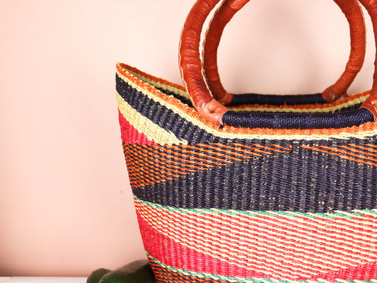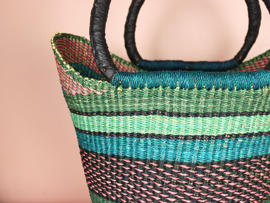 Bolga-Einkaufstasche in offener Webart in Rosa, Türkis und Naturbraun