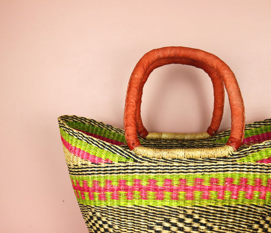 Bolga-Tragetasche in offener Webart in Rosa und Limettengrün