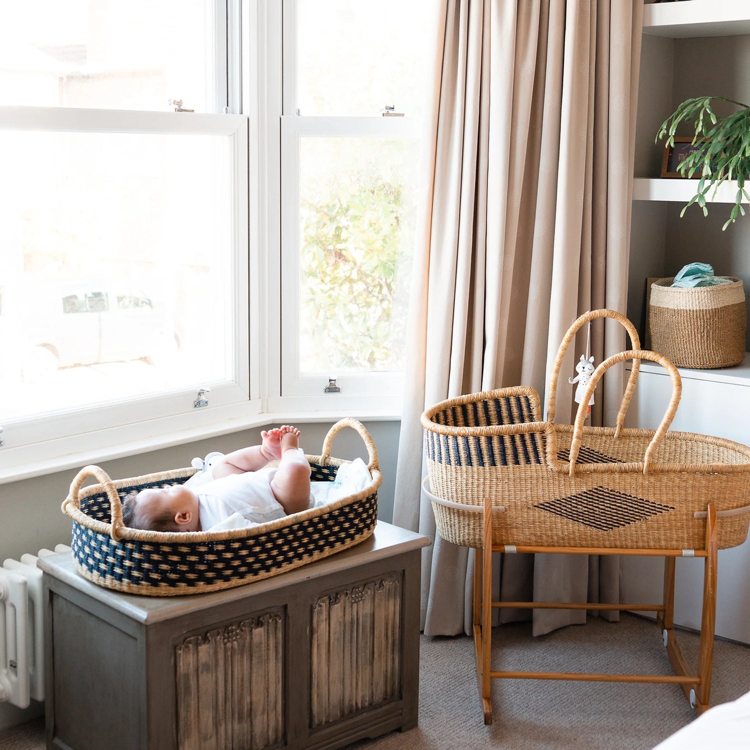 Les matelas sont vendus séparément et vous pouvez utiliser un support de couffin tissé. Nos couffins à langer sont tout aussi confortables. Ils peuvent être posés au sol ou sur une table. Nos couffins ghanéens sont disponibles dans différents motifs et couleurs.